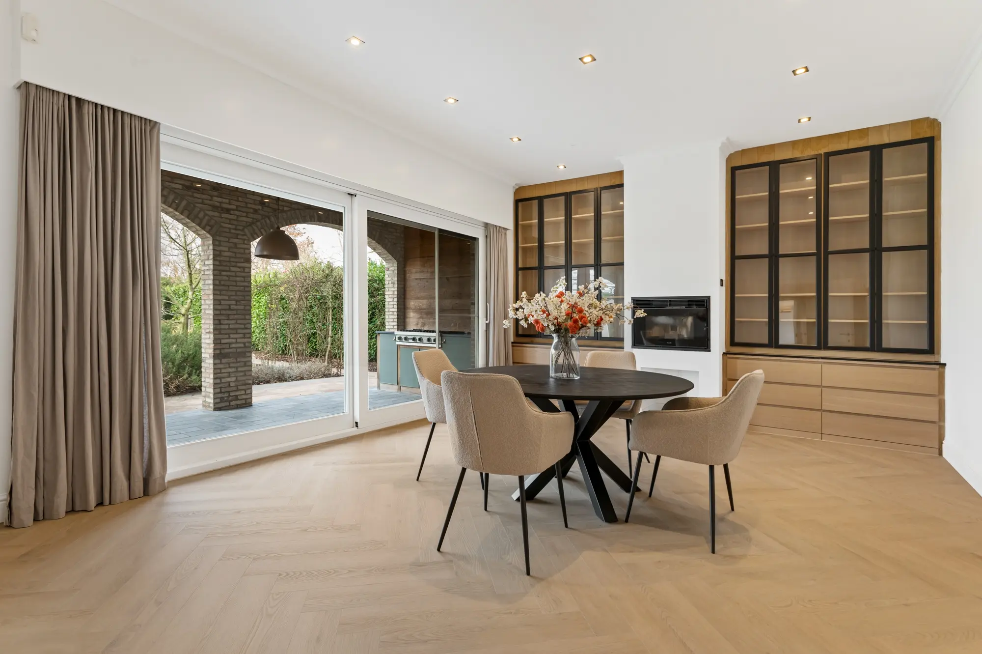 De leefruimte baadt in natuurlijk licht dankzij de grote raampartijen en combineert een gezellige zithoek met een royale eethoek.
