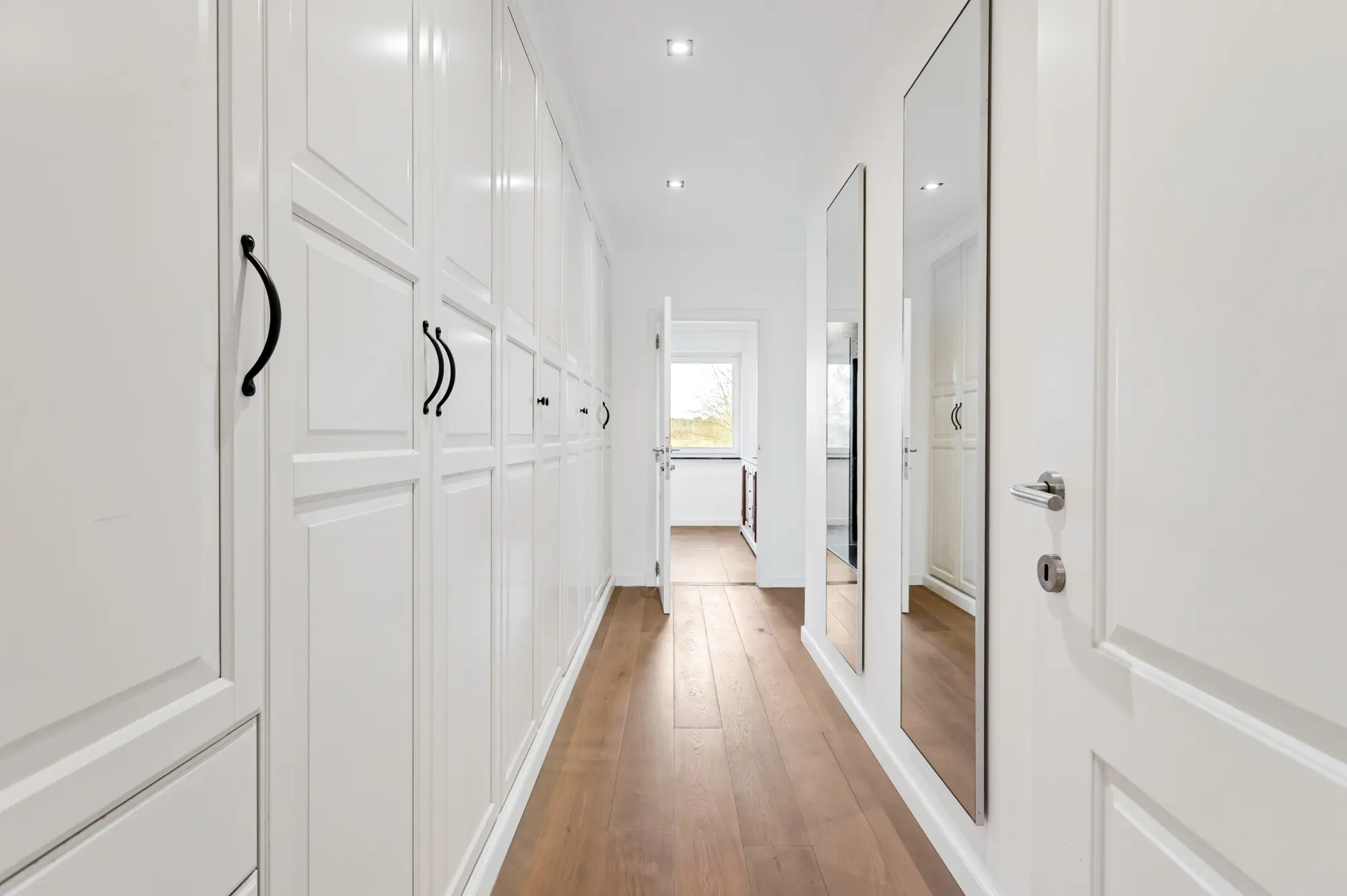 Via de hal bereik je de functionele badkamer en een elegante bureauruimte met extra bergruimte.