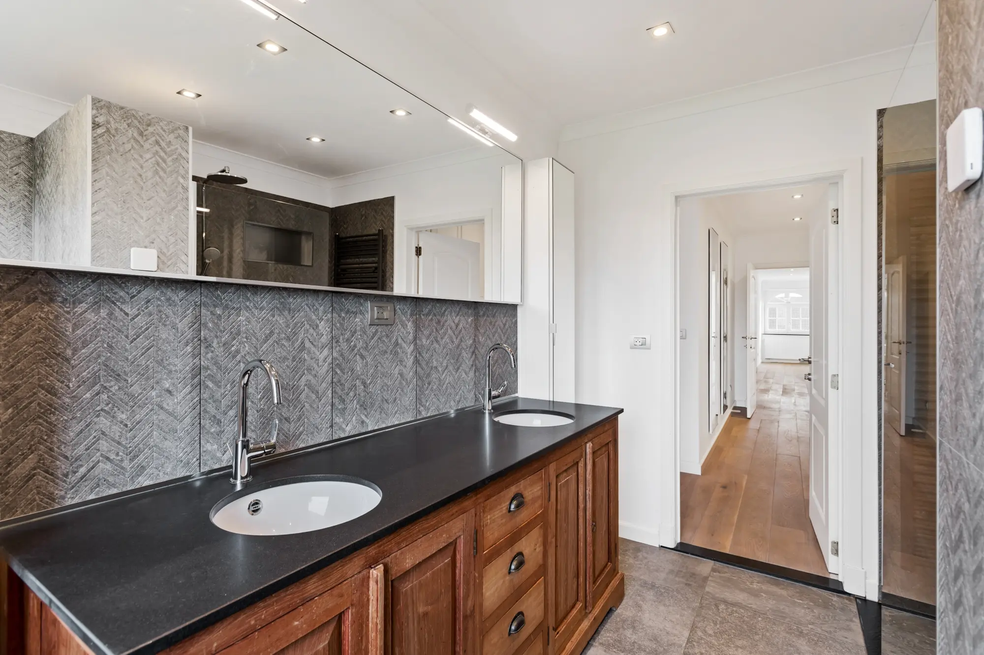 Deze is voorzien van een dubbele wastafel, een luxueuze inloopdouche met sunshower en vloerverwarming, wat bijdraagt aan een gevoel van comfort.