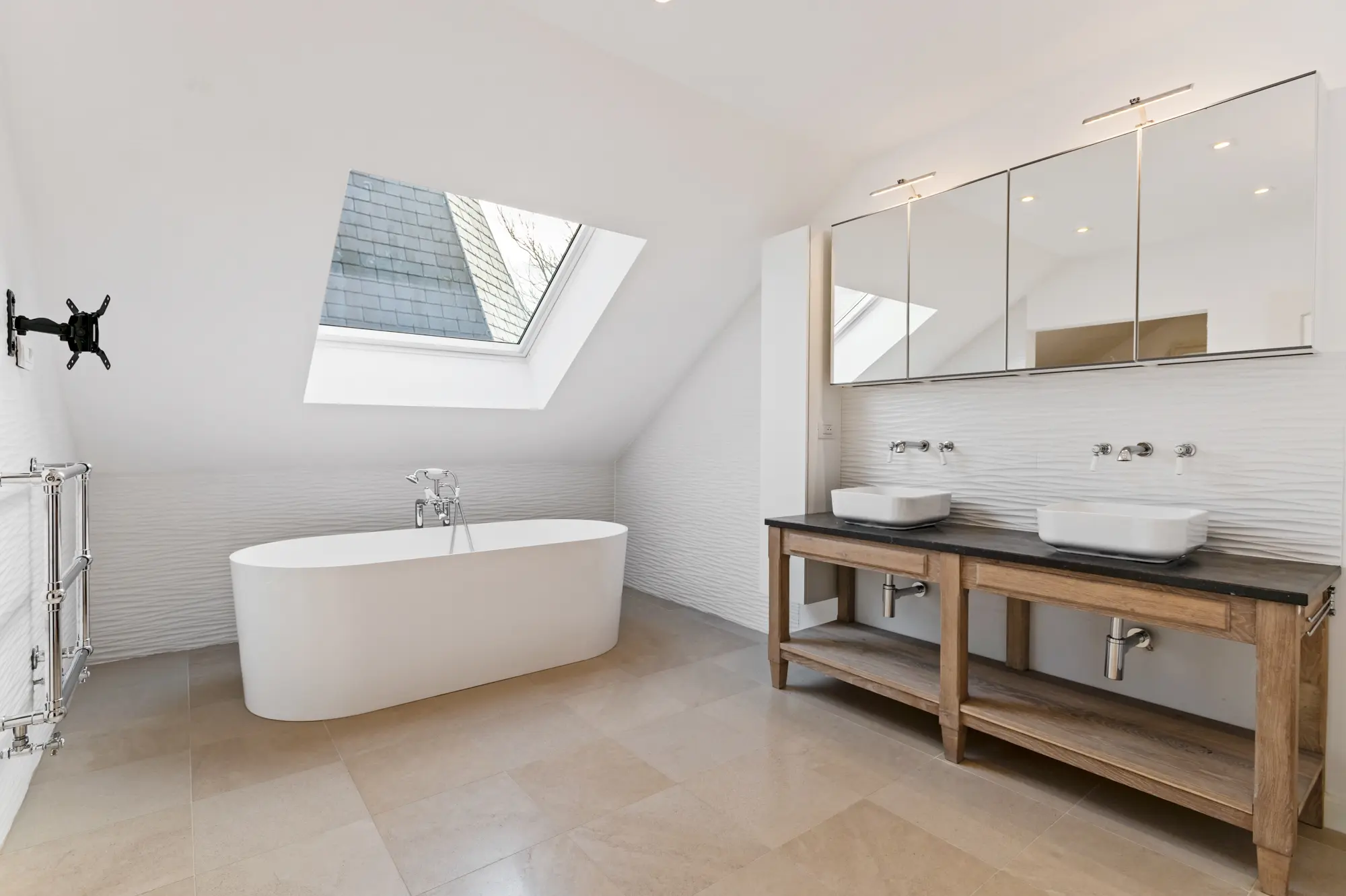 Ze is uitgerust met dubbele inloopdouche met regendouche en sunshower, een elegant ligbad, een dubbele wastafel, een geïntegreerde televisieaansluiting en een wasluik naar de wasplaats.