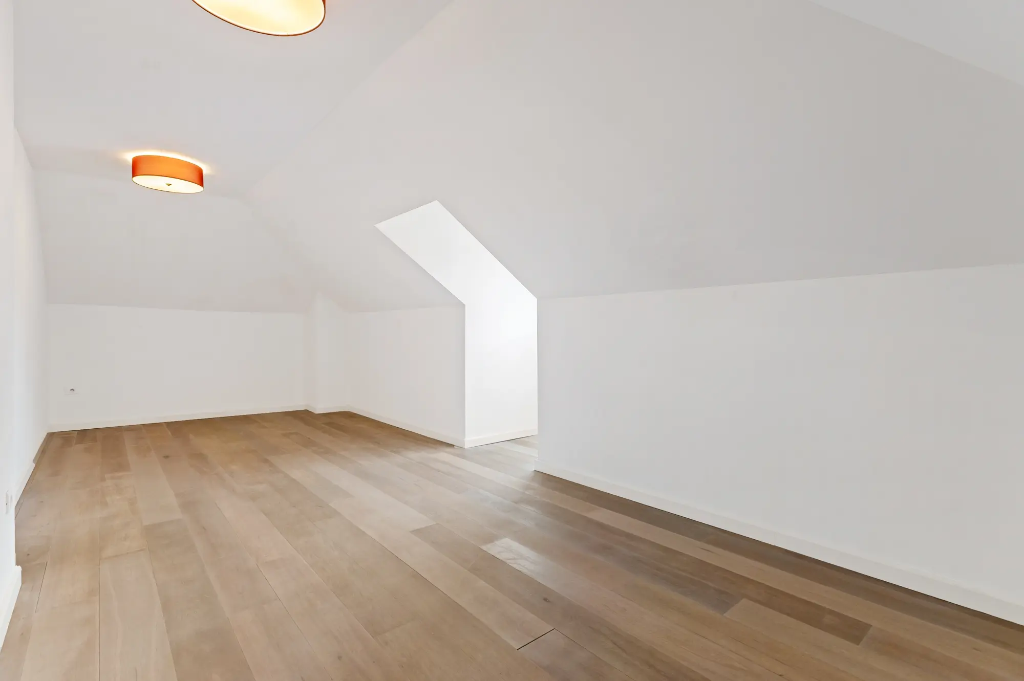 Via de nachthal, verfijnd afgewerkt met ingebouwde kasten en een tweede wasplaats met een handige waskoker vanuit de badkamer, bereiken we vijf riante slaapkamers en een royale badkamer met apart toilet.