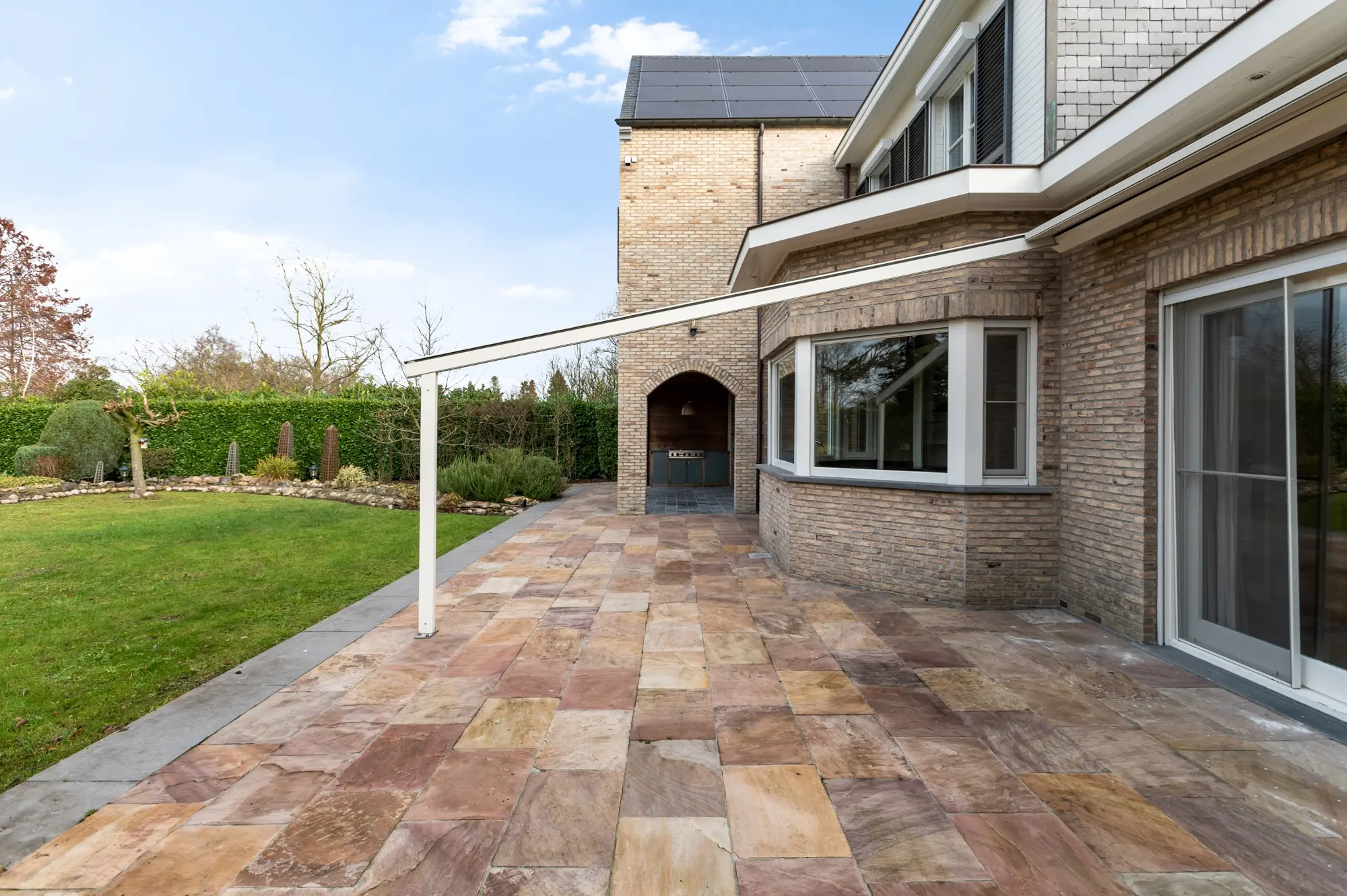 Achteraan het perceel bevindt zich een stijlvolle patio, afgewerkt met blauwe hardsteen en voorzien van stroomaansluitingen voor een jacuzzi.