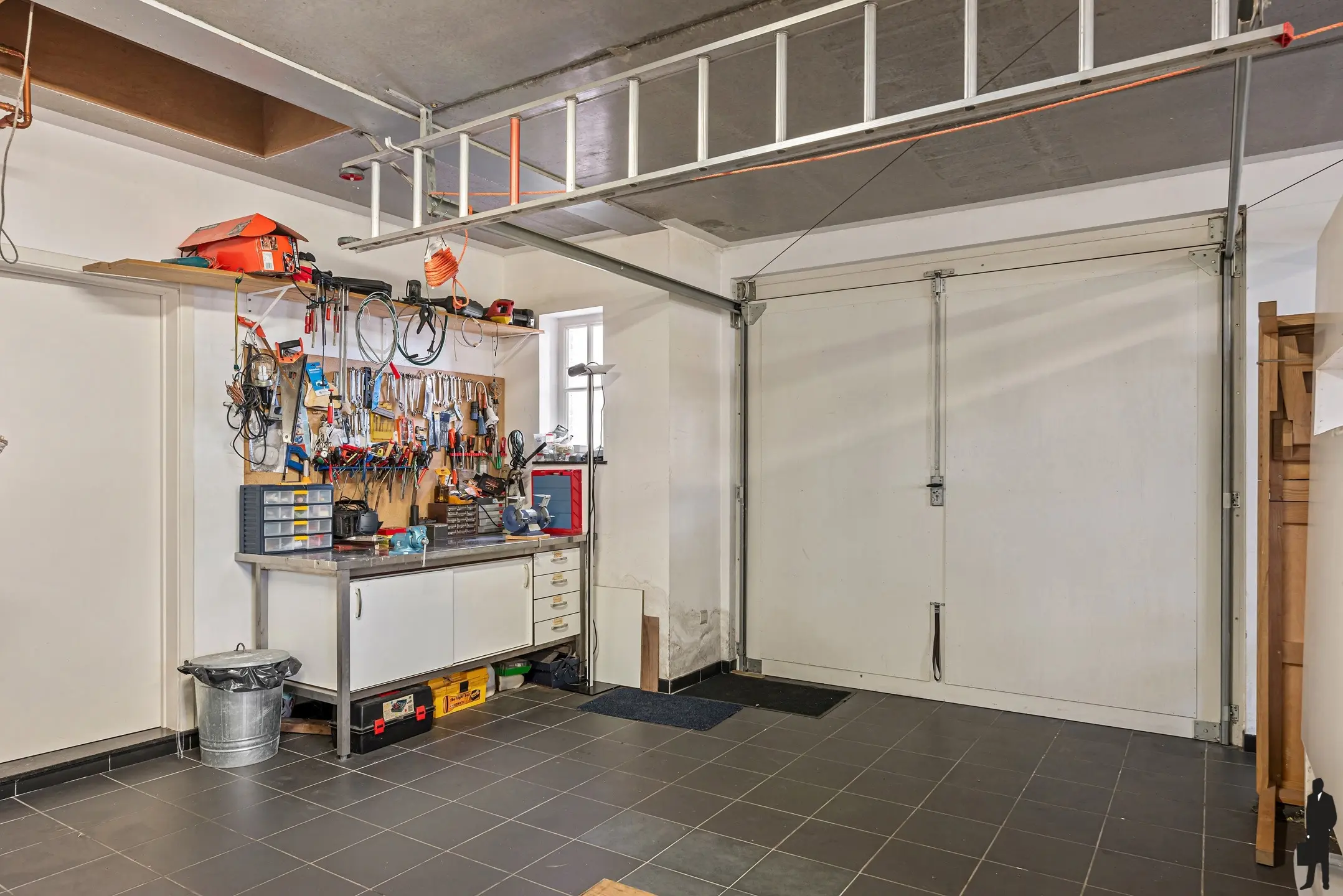 Bij de achteringang bevindt zich de bijkeuken met aansluiting voor wasmachine en droger, extra bergruimte en toegang tot de dubbele inpandige garage met smeerput.