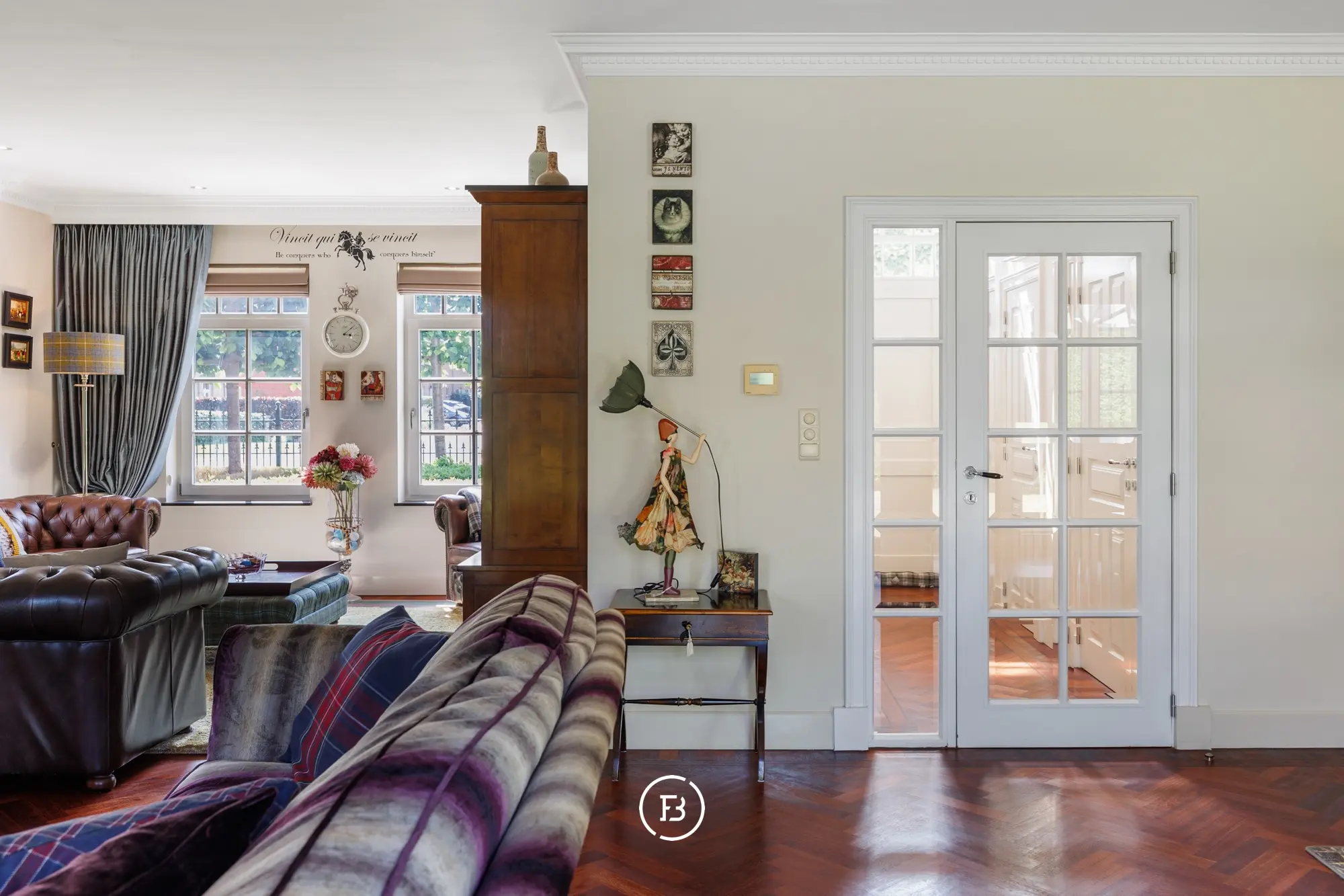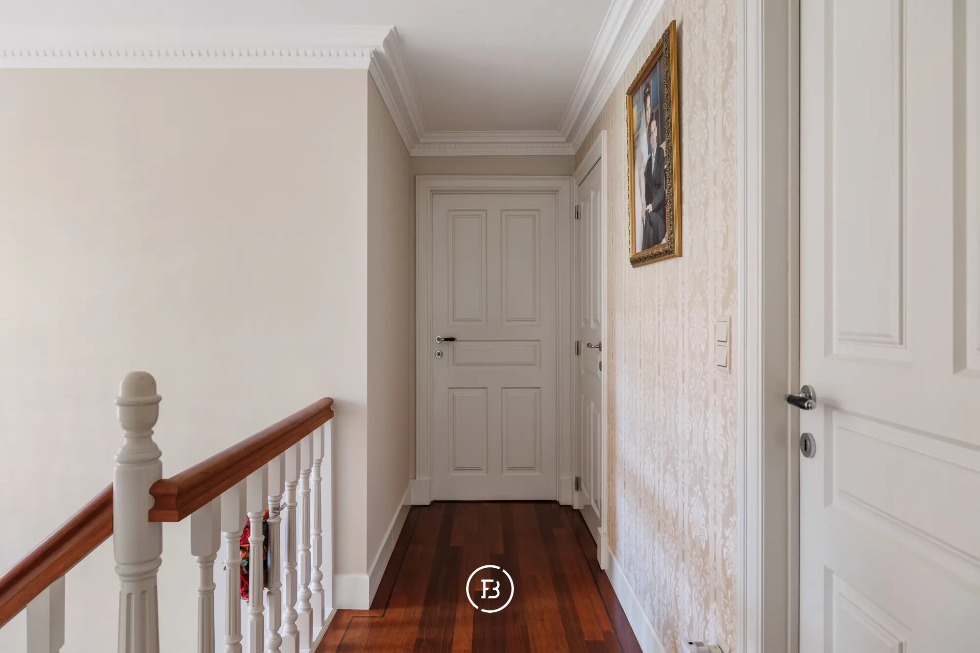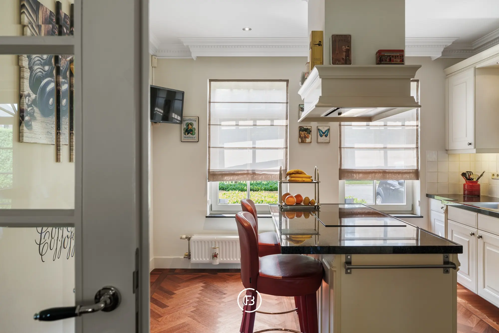 Bij het betreden van de woning valt meteen de stijlvolle parketvloer op, die in een elegant visgraatmotief doorloopt over het volledige gelijkvloers, inclusief de keuken.