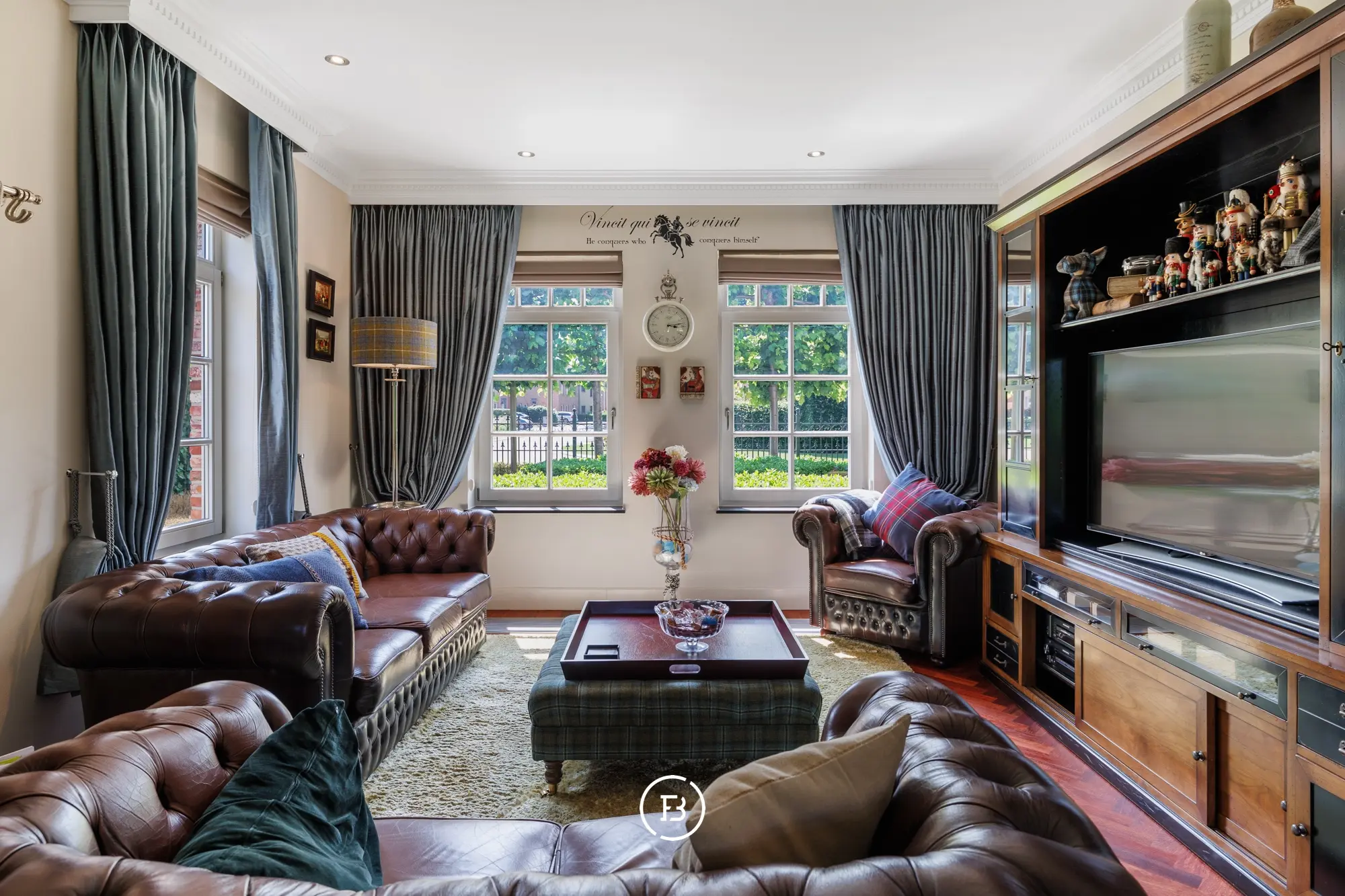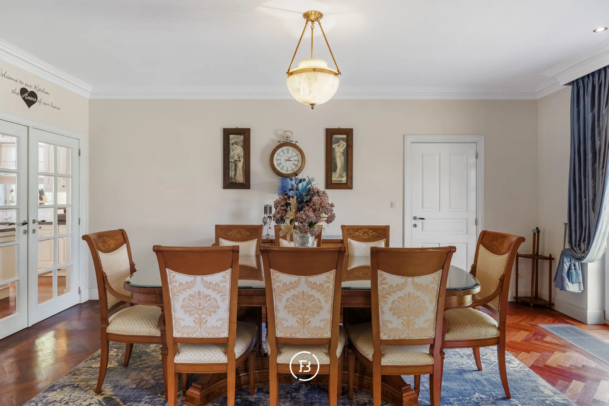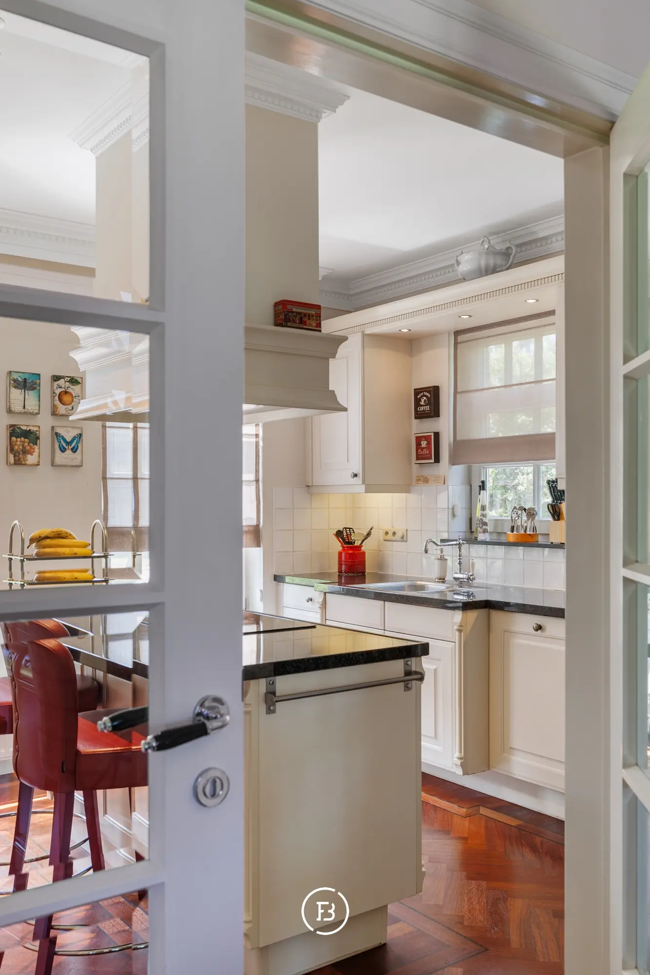 Bij het betreden van de woning valt meteen de stijlvolle parketvloer op, die in een elegant visgraatmotief doorloopt over het volledige gelijkvloers, inclusief de keuken.