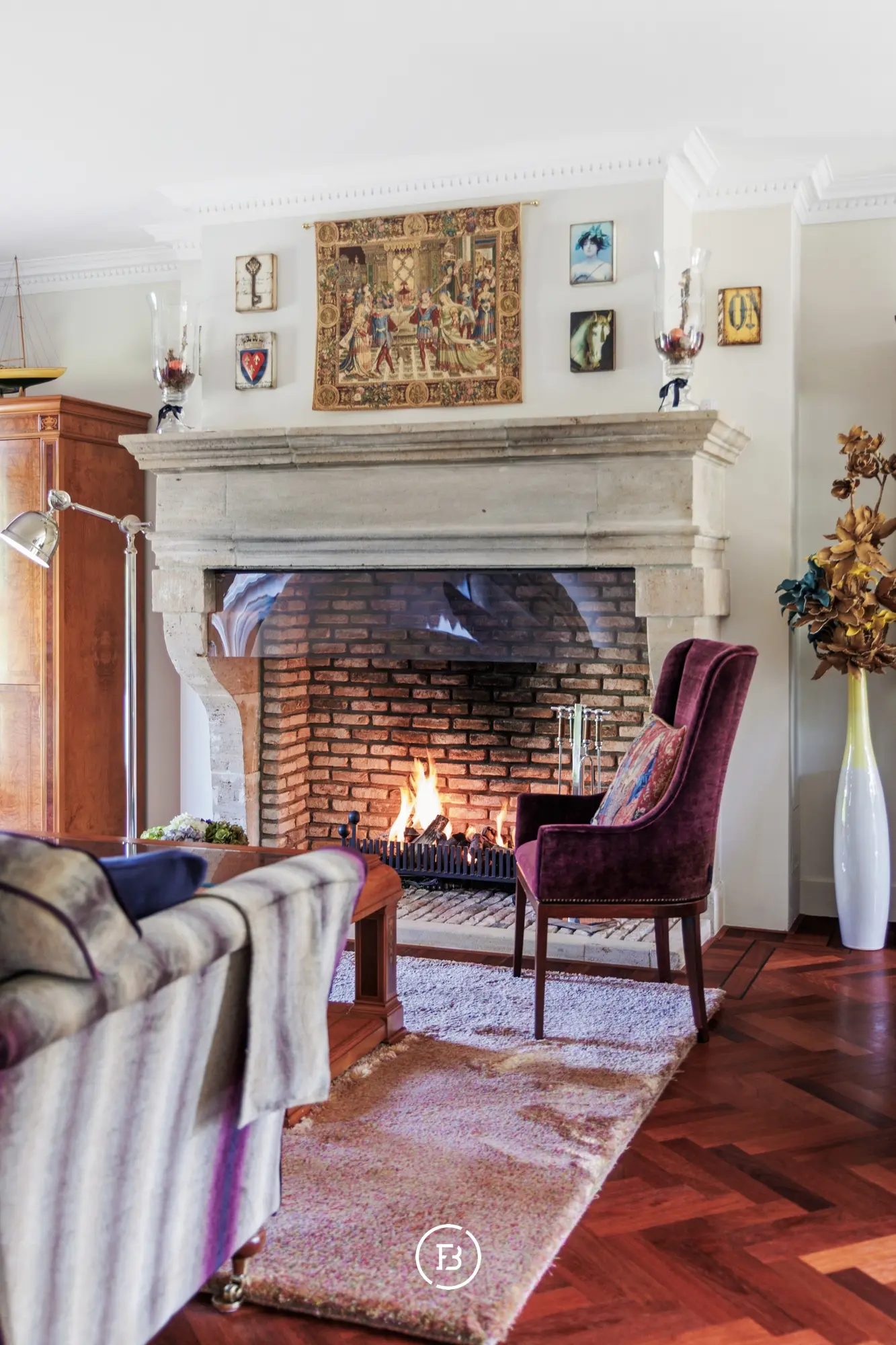 De leefruimte is voorzien van een sfeervolle haard, wat het hart vormt van deze gezellige woning.
