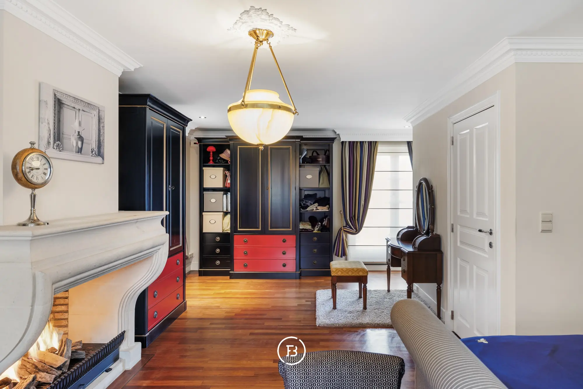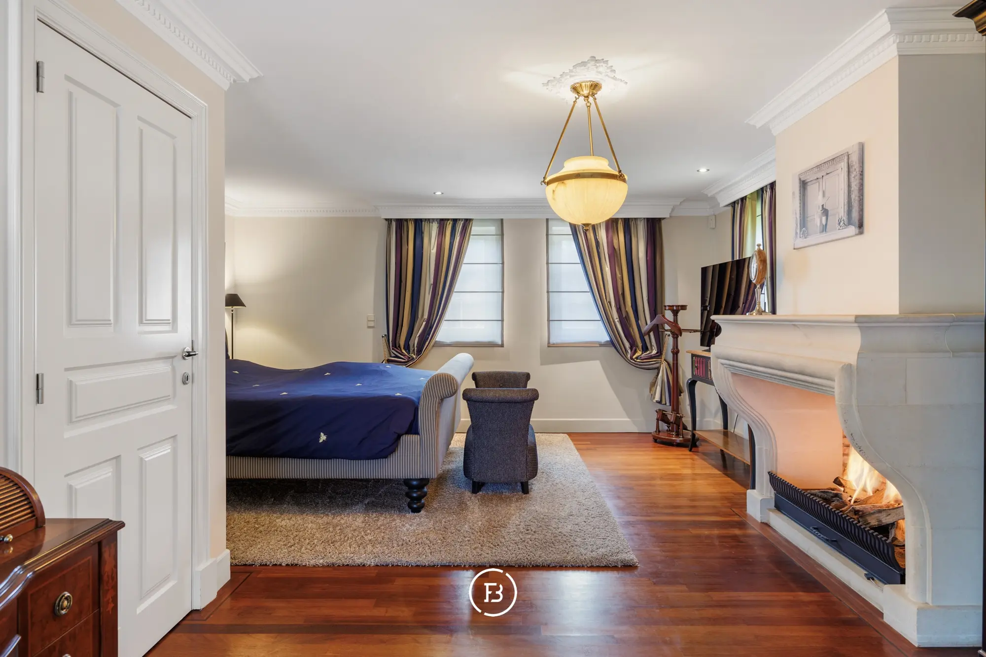 Op de eerste verdieping bevindt zich de master bedroom met een eigen haard en directe toegang tot een ruim en zonnig terras dat uitkijkt op de verzorgde tuin.