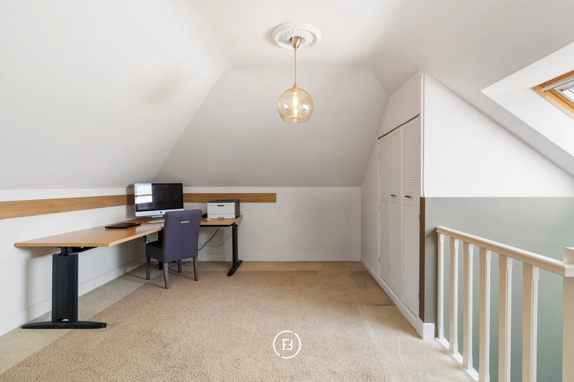 De zolderverdieping biedt een extra logeerkamer en een multifunctionele ruimte die momenteel dienstdoet als tweede bureau, maar ook perfect kan ingericht worden als extra slaapkamer of hobbyruimte.
