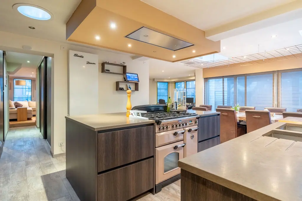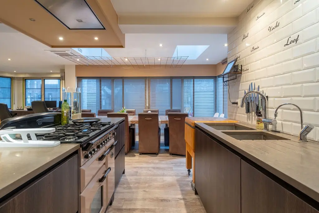 een Falcon 5-pits gasfornuis met wokbrander, warmhoudkast, oven en grill, een combi-microgolf van Atag, een Qooker, een dubbele wastafel, een AEG-vaatwasser en een Atag-afzuiging.