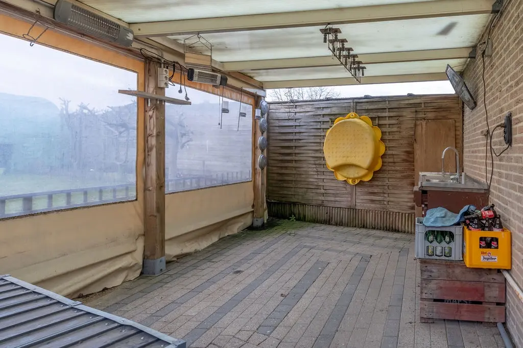 een gezellig overdekt terras achter de woning, naast de woning een hoge overkapping die tevens kan dienen als terras of carport voor bijvoorbeeld een camper, een kippenhok en een houthok.