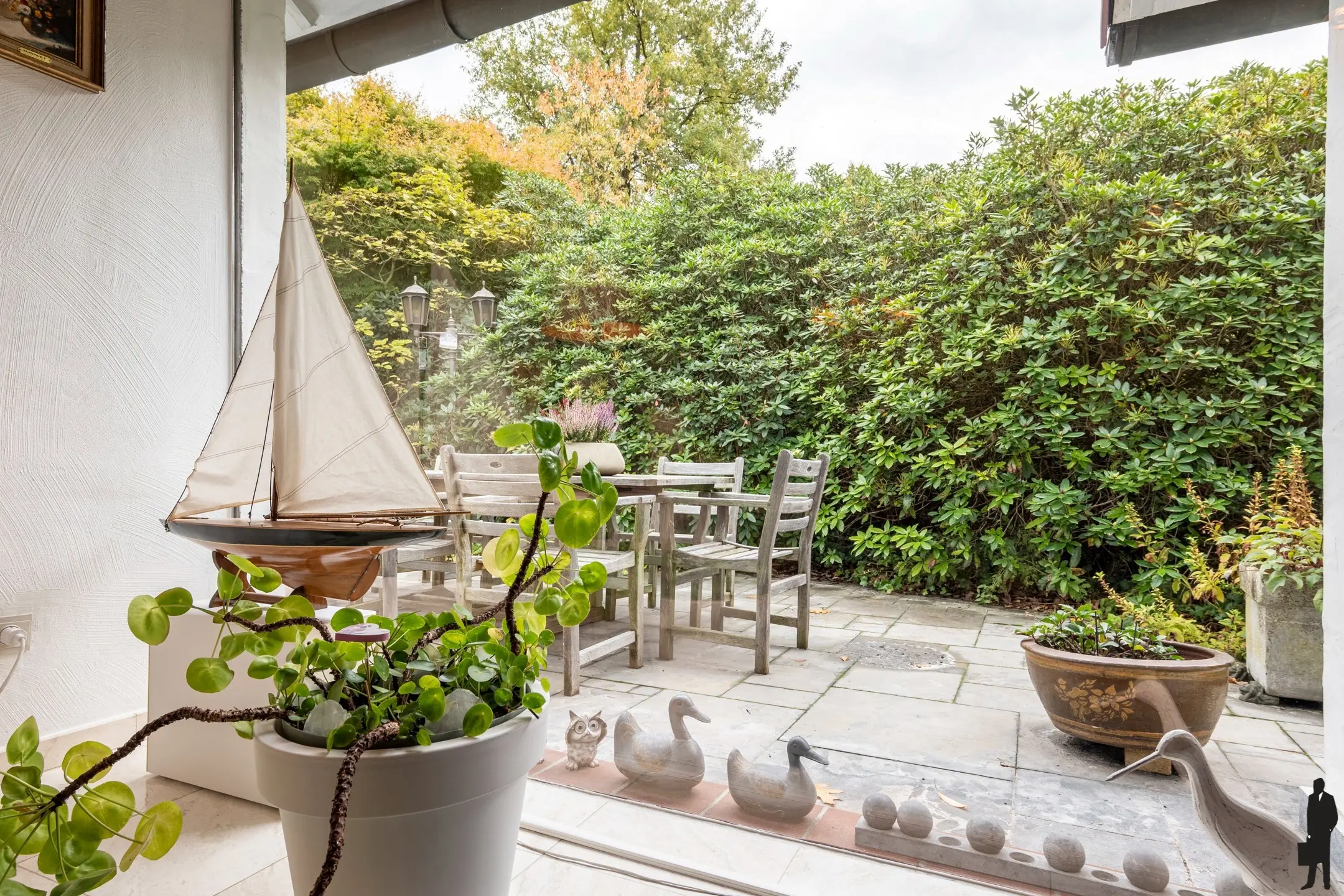 De verschillende terrassen rondom de woning geven allen uit op de brede, landelijke en private natuurtuin, georiënteerd op het oosten. U vindt er verschillende bloemenperken, heggen, heesters en loofbomen waaronder: gladiolen, magnoliabomen, Japanse esdoorn, decennia-oude rododendronstruiken, een grote krulwilg etc.