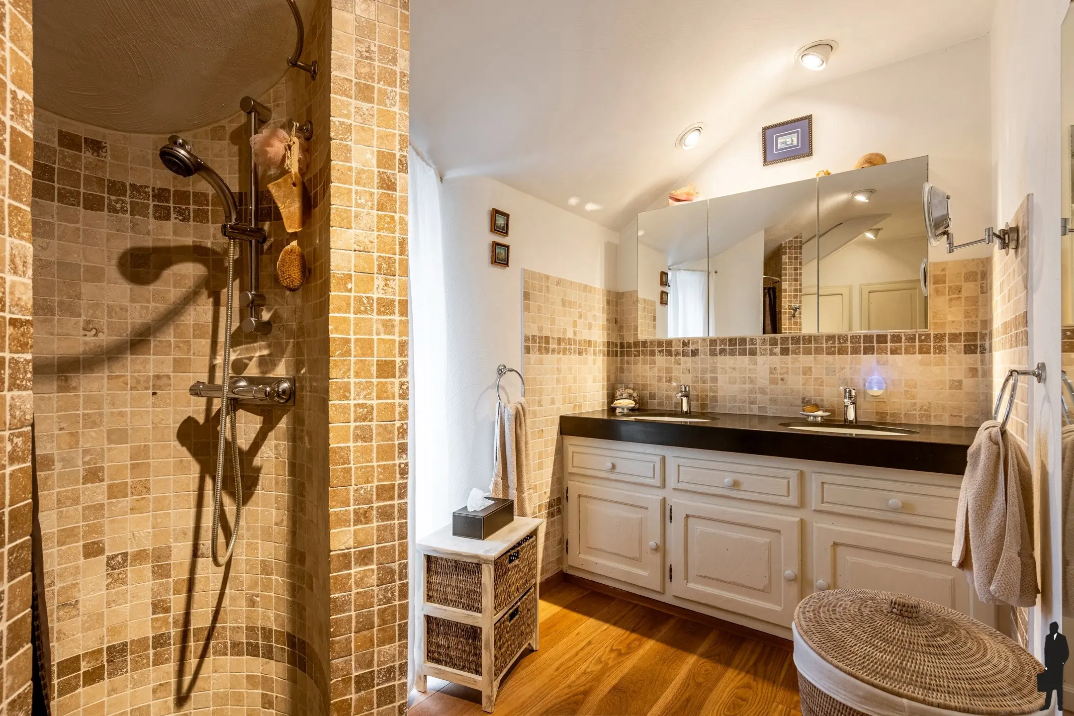 De riante hoofdslaapkamer beschikt over een ensuite badkamer met authentieke mozaïektegels en heeft toegang tot een eigen privaat ontbijtterras voor uw ochtendkoffie of ontbijt.
